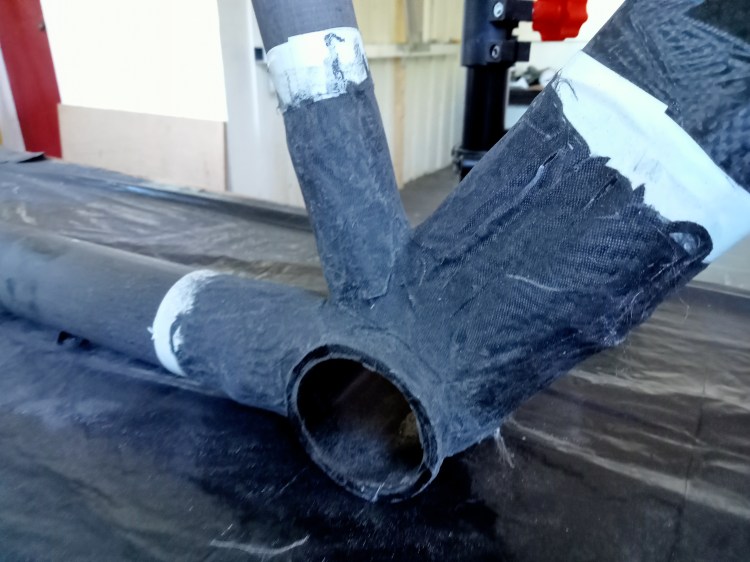 Photo: Frame joints wrapped with wet layup carbon cloth and compressed with tightly bound electrical tape.