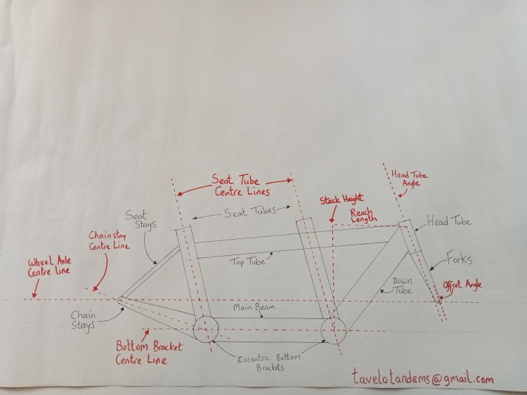 By drawing frames I could get some insight into the designs and understand them better. All I needed for this was rolls of paper, a big flat surface to draw on, a basic maths geometry set, a one metre rule and a calculator. So cost wasn’t a barrier to progress. I could spend time drawing frame plans and learn as I did so. I enjoyed it too. It soon showed the geometry challenges of creating a frame with the correct top tube height to suit both riders, the right length to make space for both to be comfortable, and a predictable ride quality and aesthetically pleasing shape. It was a challenge to find the right design mix.