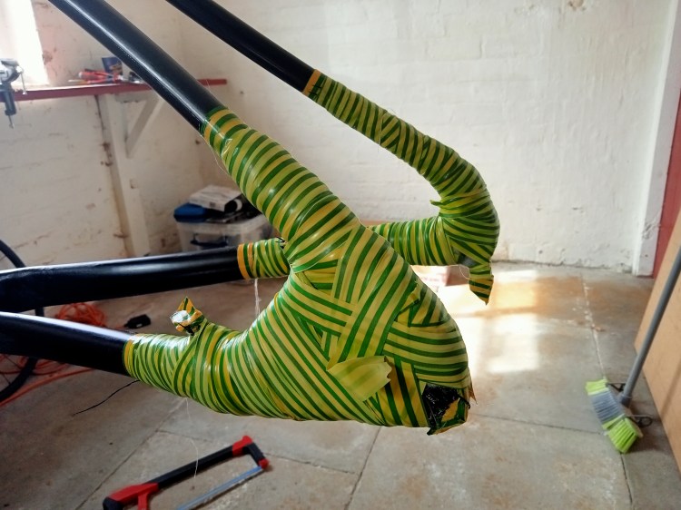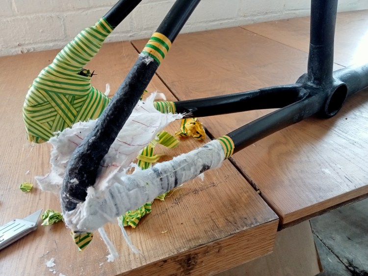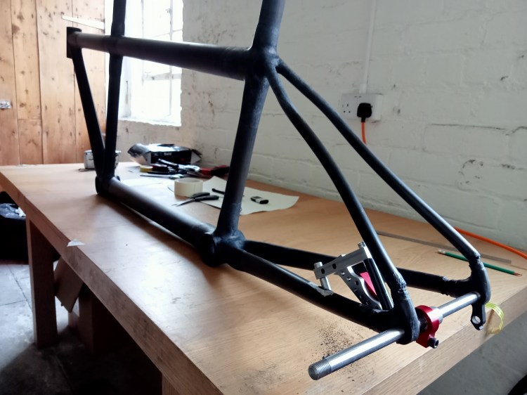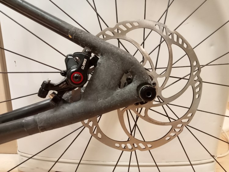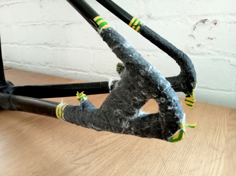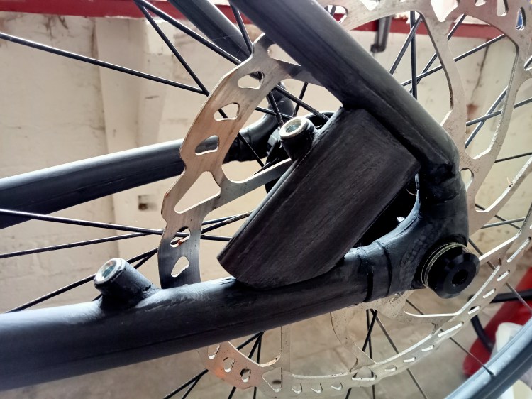I wanted to fit a 203mm brake rotor on the rear wheel and also wanted the brake calliper to be on the chain stay inside the rear triangle for a cleaner loo to the frame. I made a cardboard disc rotor to see if it would fit inside the chain stay and drew diagrams to double check. It would fit. The post mount fixtures would mean cutting the chain stay and then restrengthening I which felt risky but I’d add plenty of extra carbon cloth to compensate. It looked quite brutal after being unwrapped but some gentle sanding soon improved it.