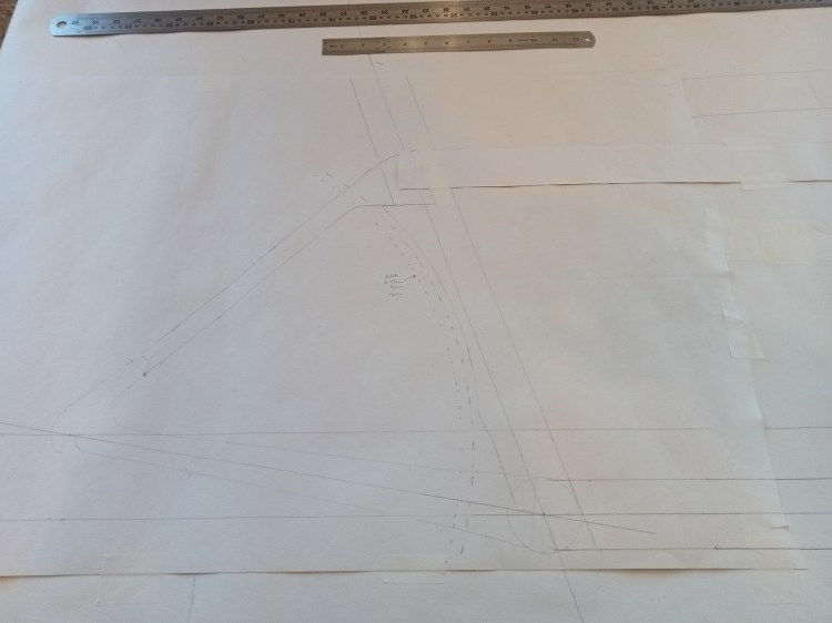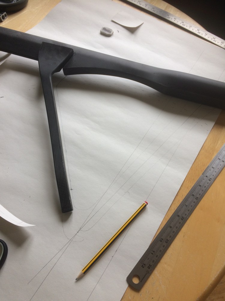 I drew out the frame geometry on a giant piece of white wall paper, drawing all the centre lines first and the geometry vertices, then added the bottom bracket shells, main beam and rear dropouts.